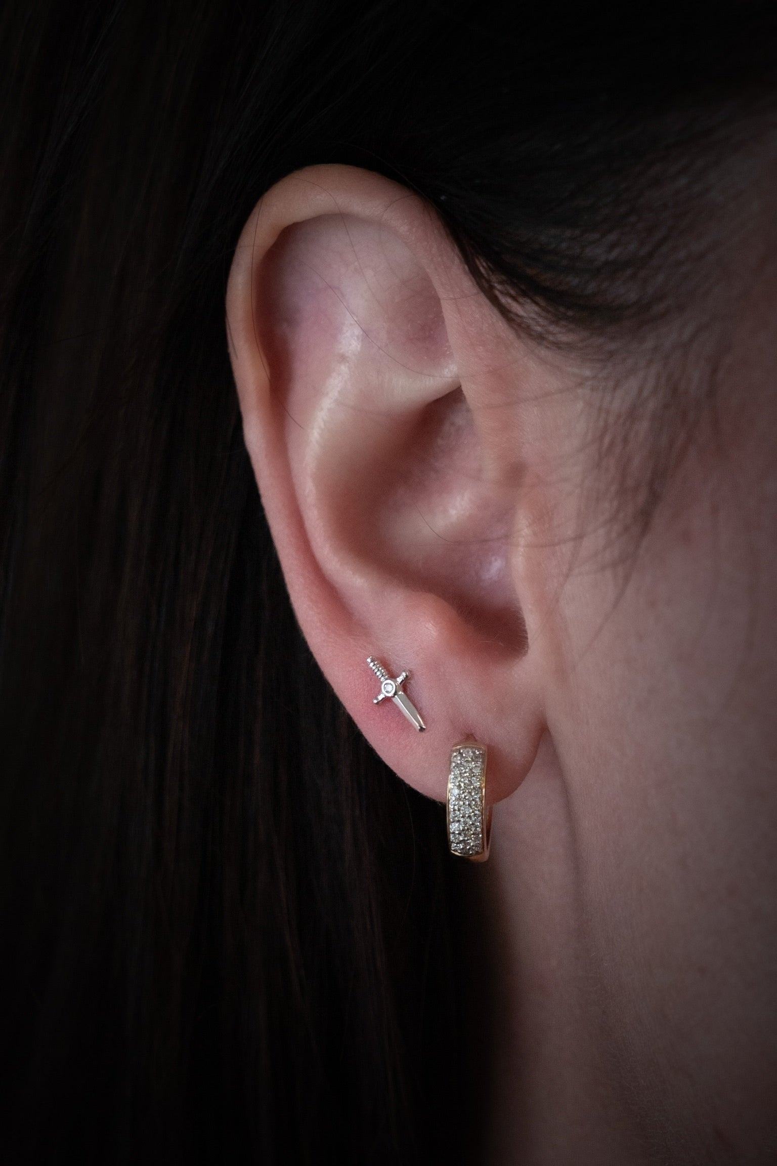 Dare to be bold. These 14k solid gold dagger studs including lab grown diamonds have the perfect balance of dark romance and sharp edge.